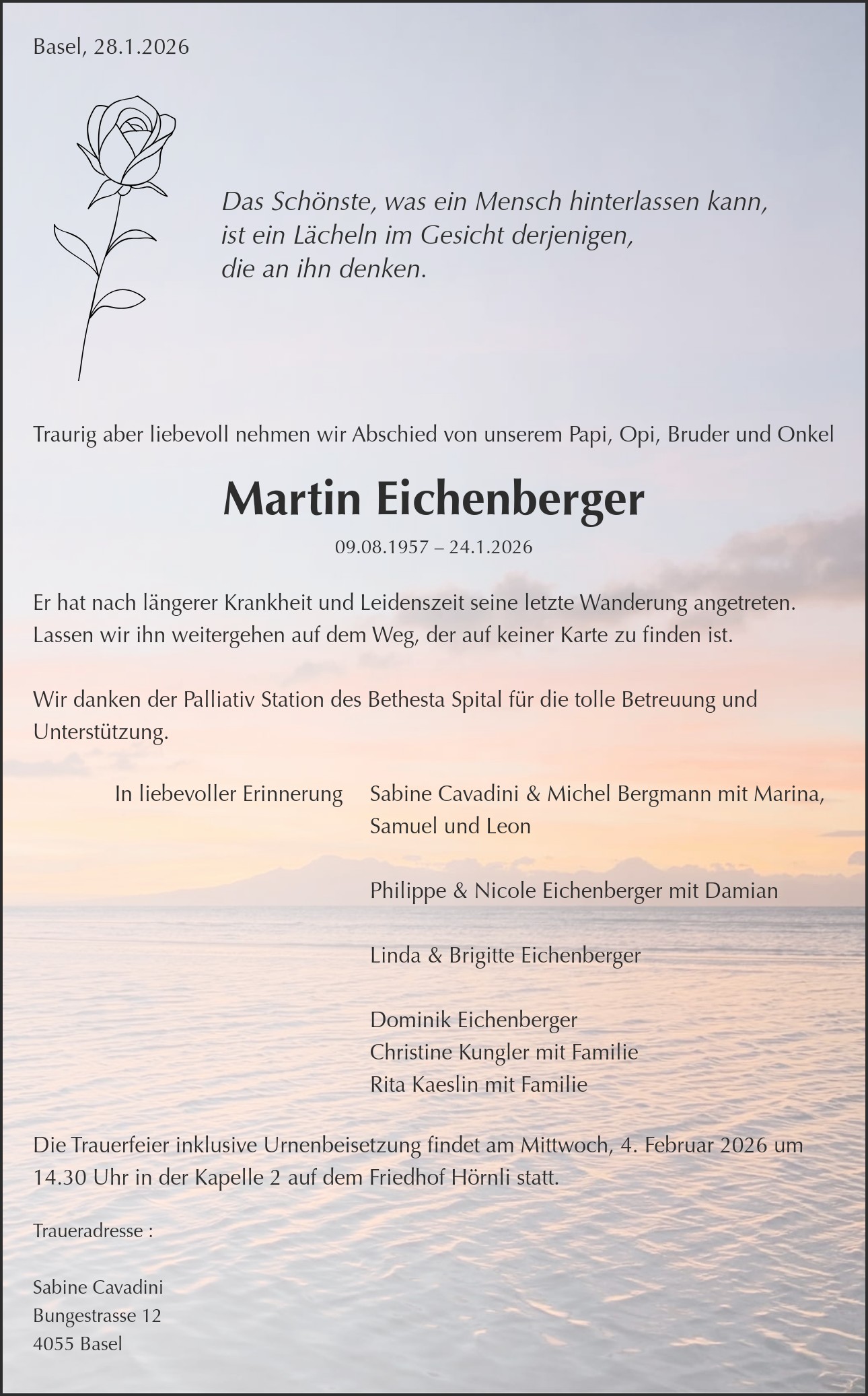 Traueradresse : Sabine Cavadini Bungestrasse 12 4055 Basel