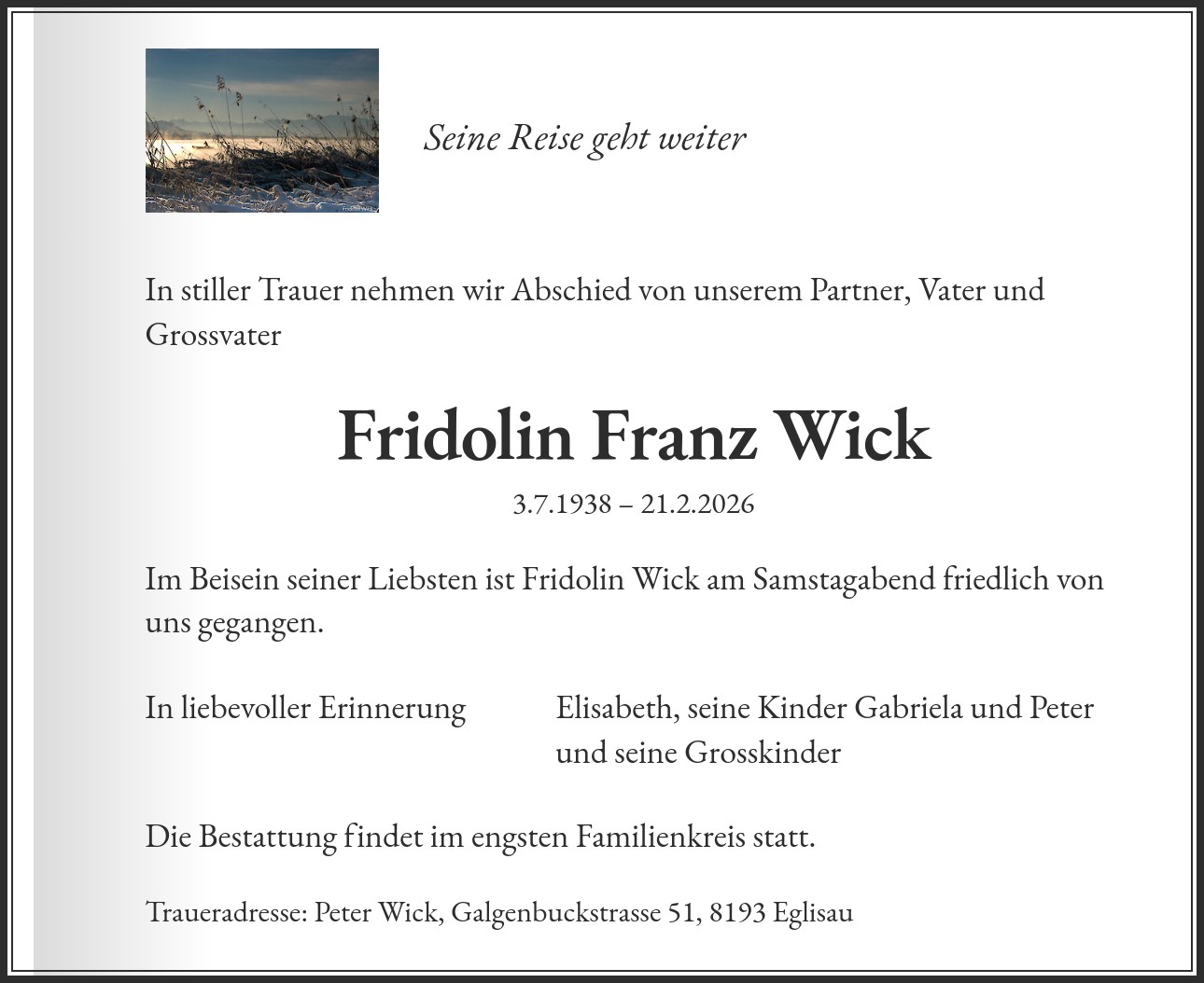 Traueradresse: Peter Wick, Galgenbuckstrasse 51, 8193 Eglisau