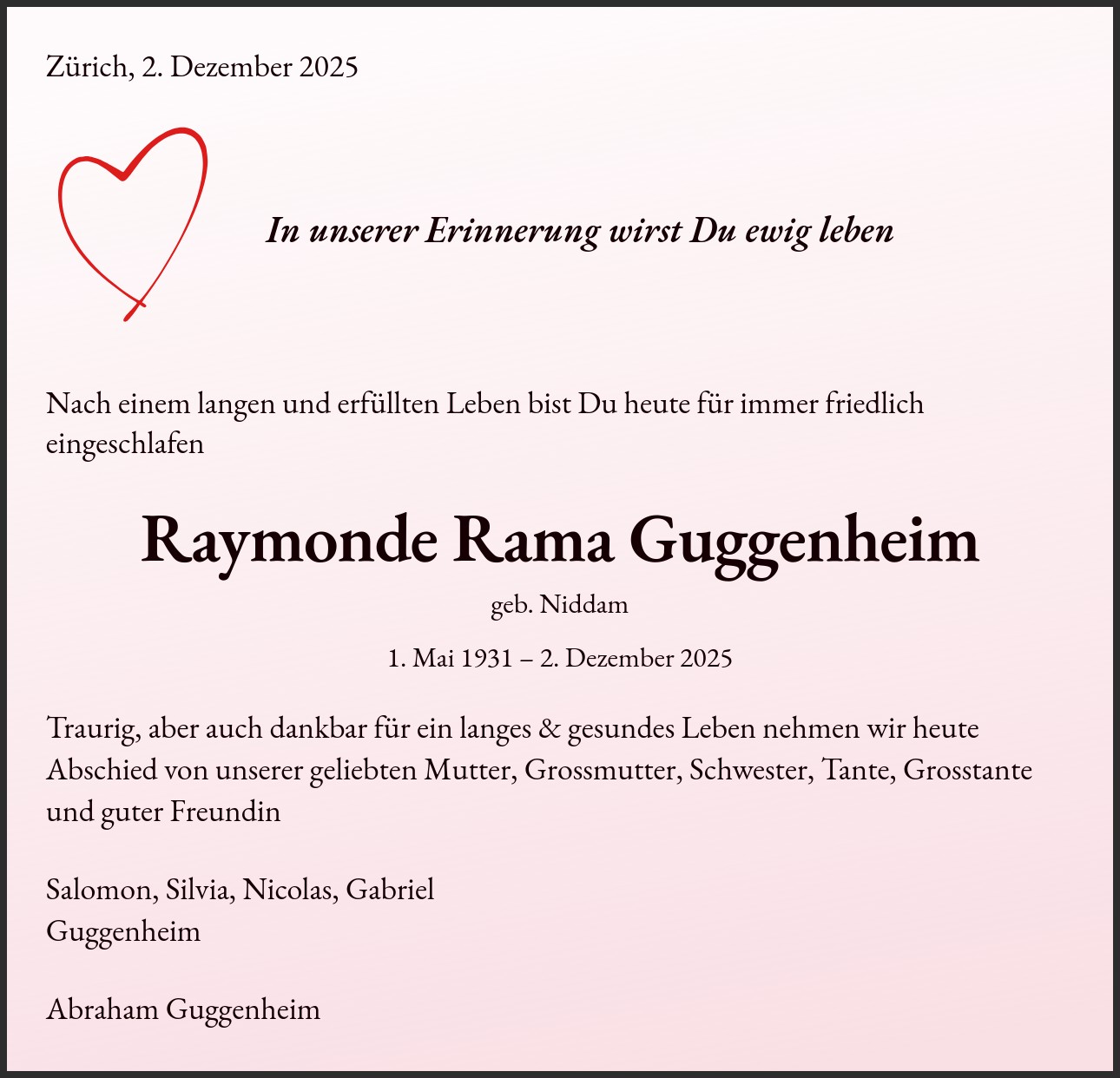 Traurig, aber auch dankbar für ein langes & gesundes Leben nehmen wir heute Abschied von unserer geliebten Mutter, Grossmutter, Schwester, Tante, Grosstante und guter Freundin