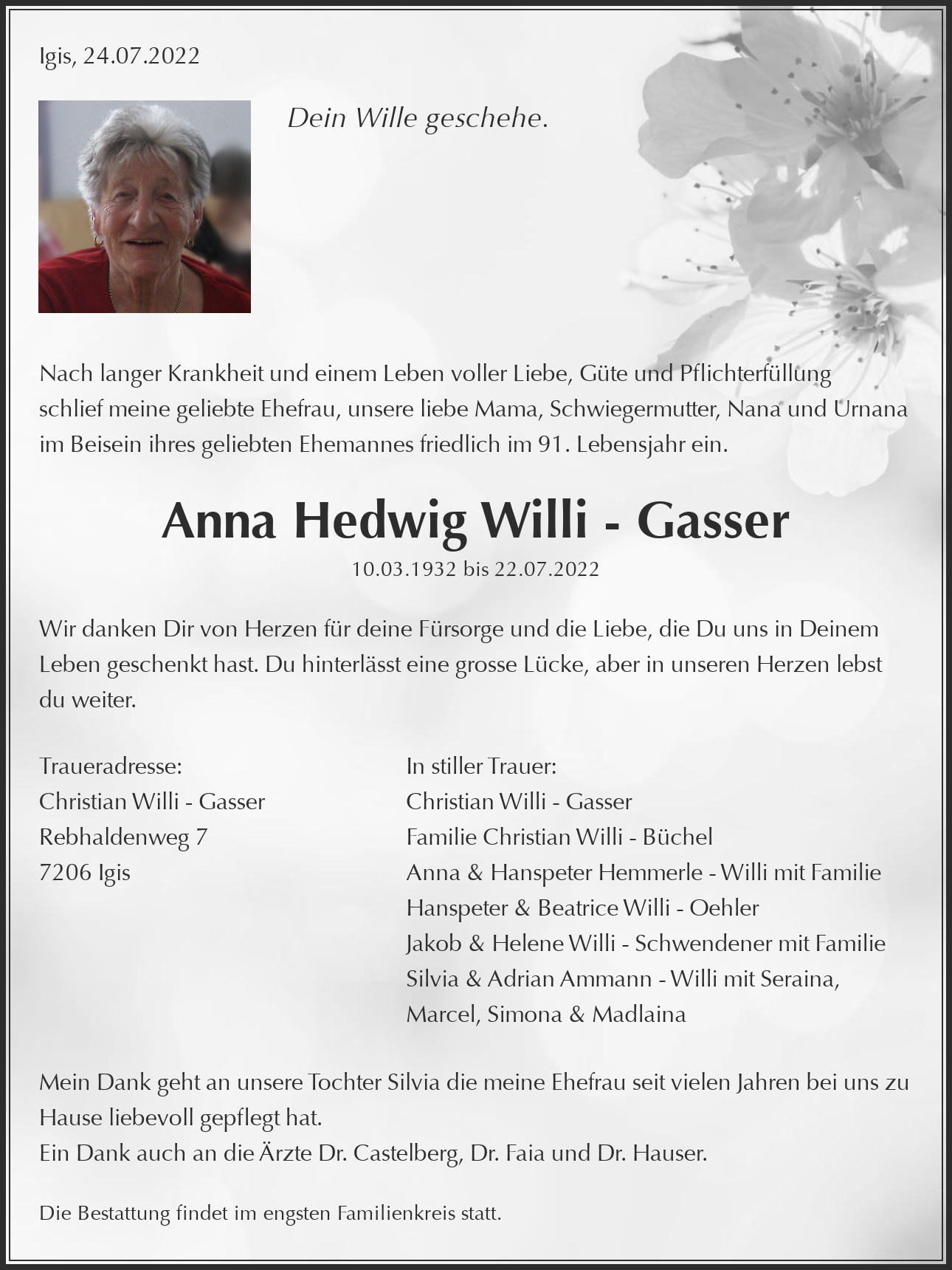 Traueradresse: Christian Willi - Gasser Rebhaldenweg 7 7206 Igis